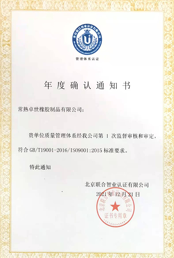 2021年常熟卓世顺利通过质量体系认证中心ISO9001:2015/16质量管理体系认证, 并荣获北京联合认证管理有限公司颁发的证书。