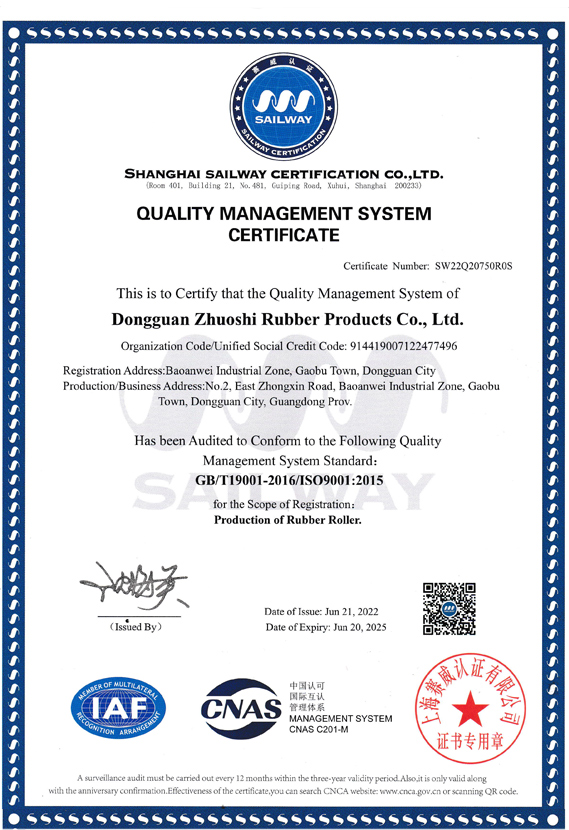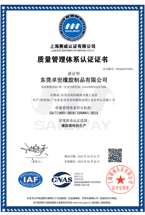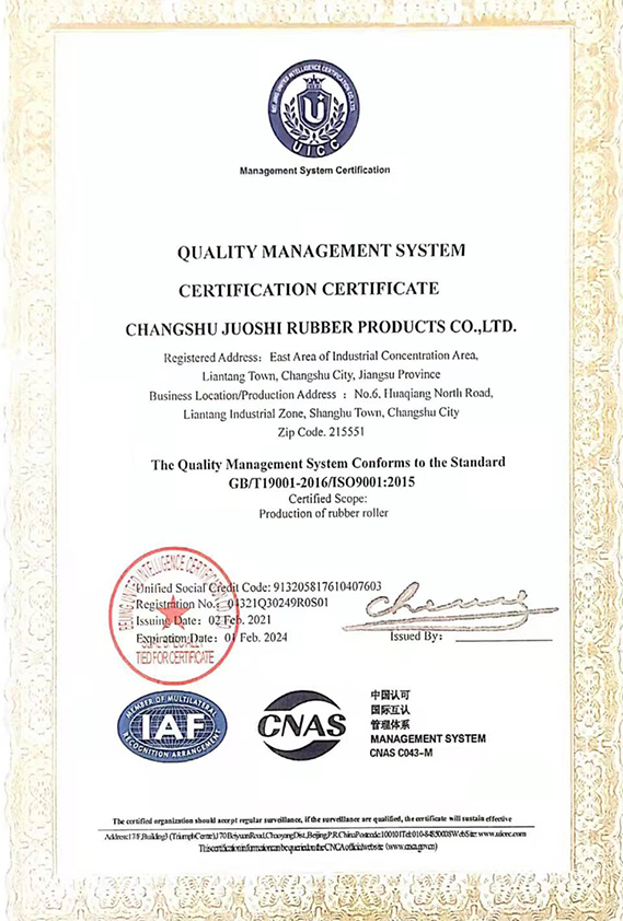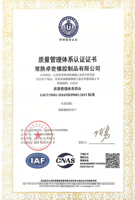 常熟卓世以科学人性化的管理、专业的技术团队、创新的研发理念、优良的服务品质、贴心的专业服务、精英业务销售团队,赢得同行业内和客户的一致认可,在国内胶辊行业中已成为最专业的胶辊生产厂家并已成为胶辊行业内屈指可数的名牌,卓世人一直以质量求生存、以信誉求发展、以优质的服务为宗旨,且通过努力成功获得质量体系ISO9001:2015/16质量管理体系认证,并以确保客户“买了放心、用了安心、生产有信心”。